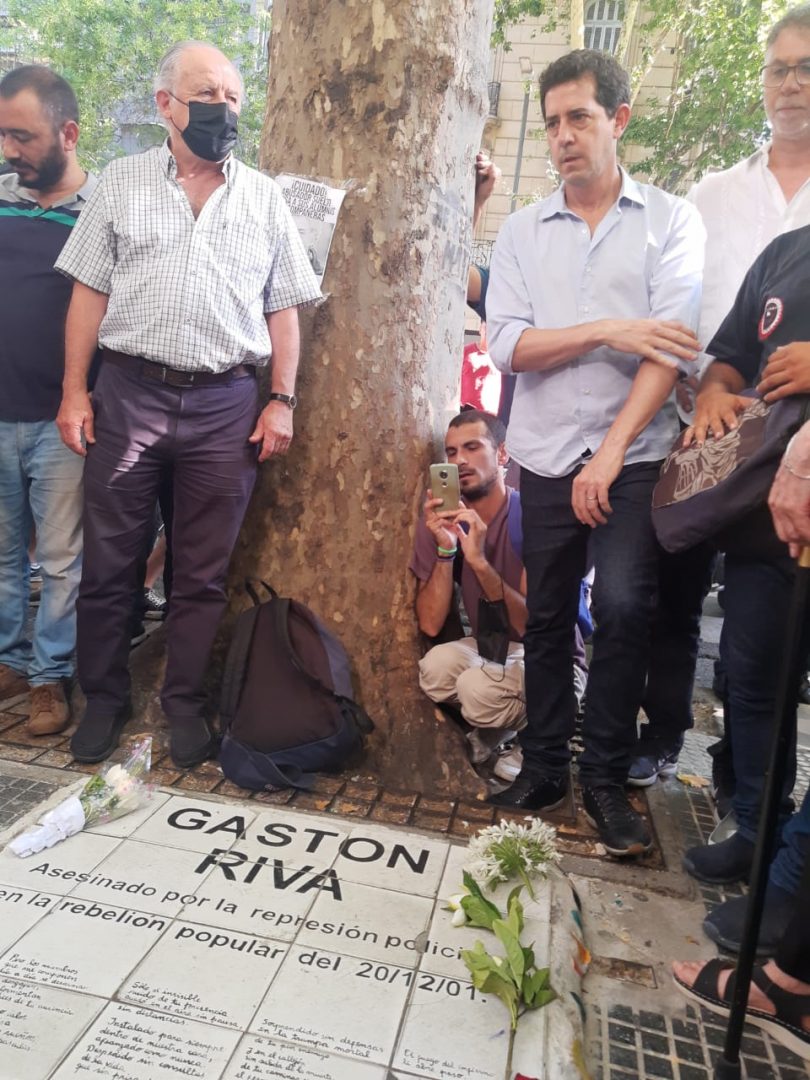 El itinerario realizado partió a las 16 horas de Sarmiento y Pellegrini, donde se encuentra la placa del compañero Alberto Márquez, y recorrió cada una de las placas que recuerdan a los asesinados: Hipólito Yrigoyen y Av. 9 de Julio, placas de Diego “Nano” Lamagna y Carlos “Petete” Almirón; Tacuarí y Avenida de Mayo, placa de Gastón Riva; y Chacabuco y Avenida de Mayo, placa de Gustavo Benedetto. En los distintos sitios familiares y amigos hicieron uso de la palabra para reivindicar el sentido de aquella histórica rebelión popular, homenajear a los caídos y continuar el reclamo de memoria, verdad y justicia.