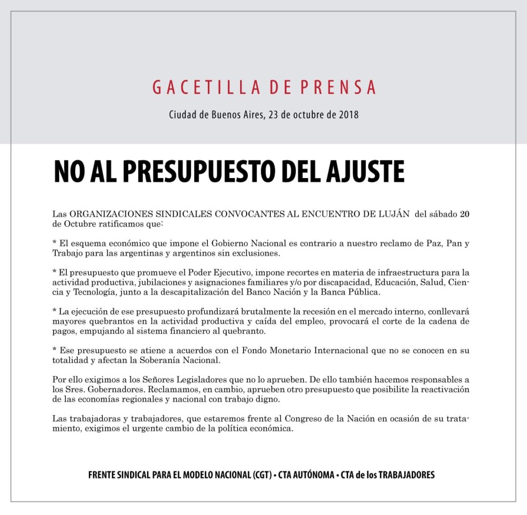 Por ello exigimos a los Señores Legisladores que no lo aprueben. De ello también hacemos responsables a los Sres. Gobernadores. Reclamamos, en cambio aprueben otro presupuesto que posibilite la reactivación de las economías regionales y nacional con trabajo digno.