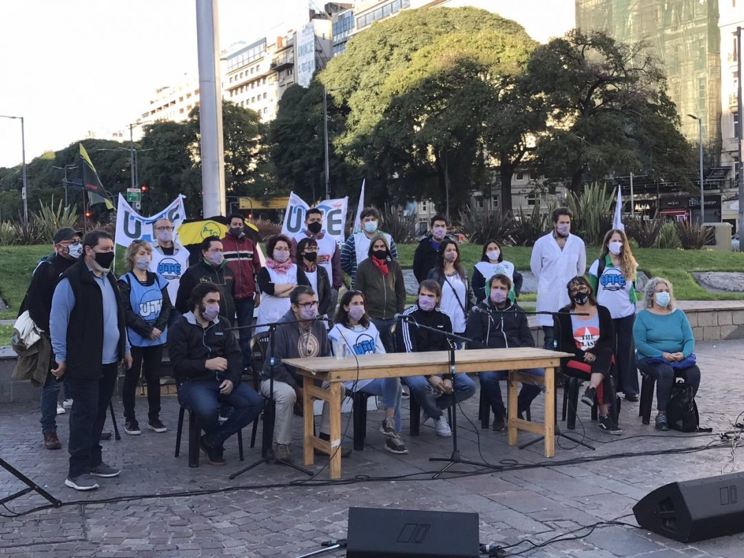 Comenzó la jornada de protesta «Lo Esencial es la Vida, no la campaña de Larreta» con una conferencia de prensa realizada a las 8 AM en el Obelisco. Allí participaron representantes de las dos CTAs de CABA, la UTEP, SiPreBA, AGTSyP, entre otras organizaciones.