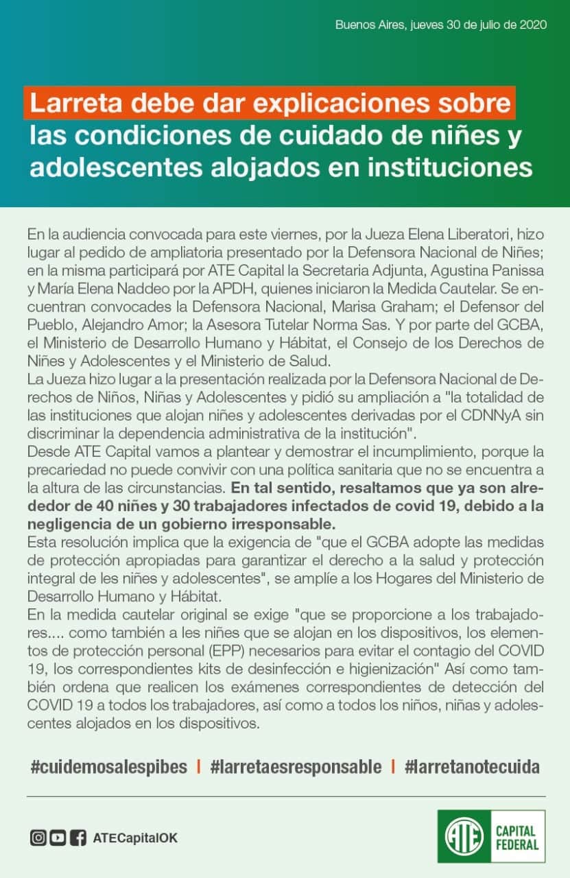 Desde ATE Capital vamos a plantear y demostrar el incumplimiento, porque la precariedad no puede convivir con una política sanitaria que no se encuentra a la altura de las circunstancias. En tal sentido, resaltamos que ya son alrededor de 40 niñes y 30 trabajadores infectados de covid 19, debido a la negligencia de un gobierno irresponsable.