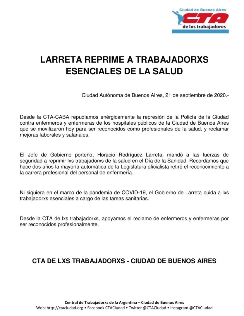 Desde la CTA-CABA repudiamos enérgicamente la represión de la Policía de la Ciudad contra enfermeros y enfermeras de los hospitales públicos de la Ciudad de Buenos Aires que se movilizaron hoy para ser reconocidos como profesionales de la salud, y reclamar mejoras laborales y salariales.