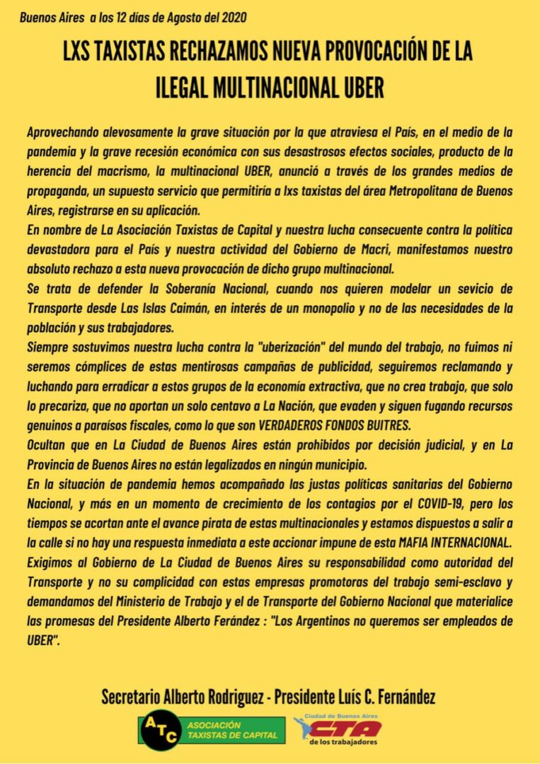 Aprovechando alevosamente la grave situación por la que atraviesa el País, en el medio de la Pandemia y la grave recesión económica con sus desastrosos efectos sociales, producto de la herencia del macrismo, la multinacional UBER, anuncio a través de los grandes medios de propaganda, un supuesto servicio que permitiría a los taxistas del Área Metropolitana de Buenos Aires, registrarse en su aplicación.