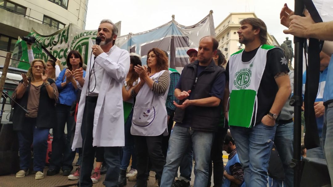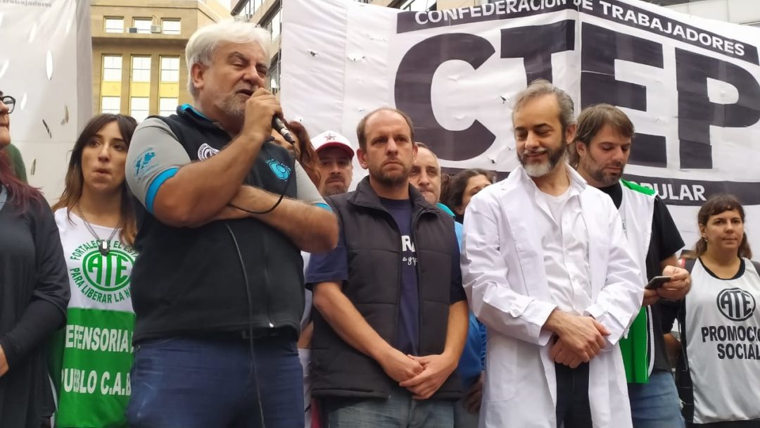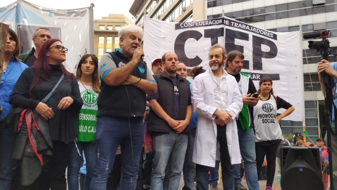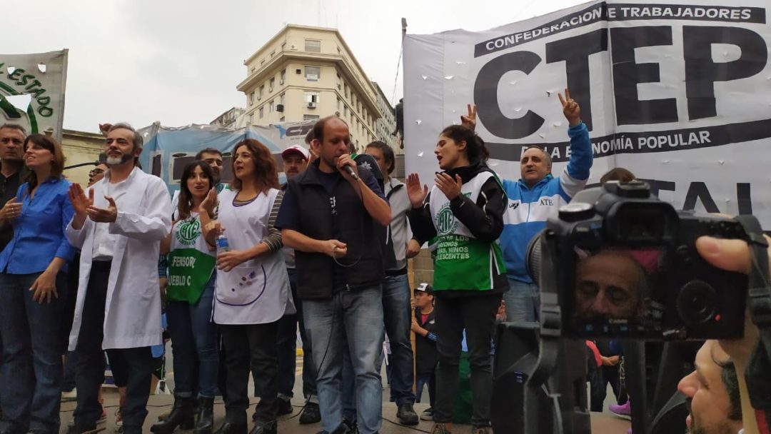 También estuvieron en el escenario, frente a la Legislatura porteña, Marina Joski, secretaria adjunta de la CTEP Ciudad, y Fidel Aguilar, secretario gremial de los docentes privados del SADOP C.A.B.A.