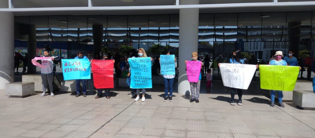 Familias, organizaciones sociales, sindicales y políticas se manifestaron hoy en la puerta del Ministerio de Educación de la Ciudad de Buenos Aires para reclamar contra los intentos de flexibilización del protocolo en las escuelas, y exigir la vacunación de la totalidad de lxs docentes de forma urgente, computadoras y conectividad para estudiantes y maestrxs.