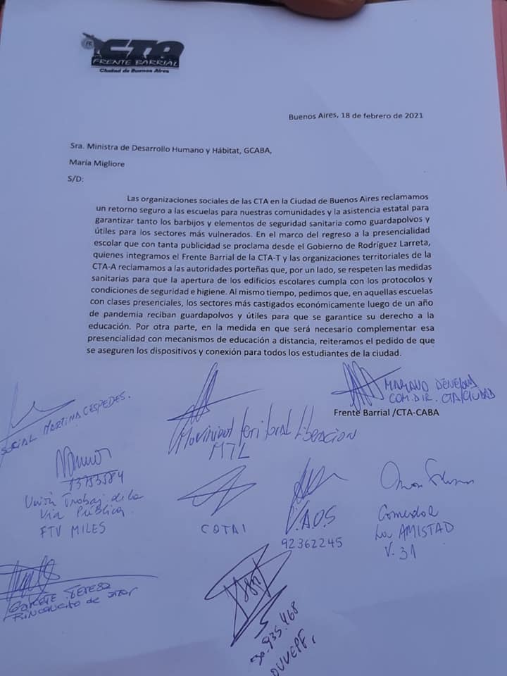 Hoy las organizaciones del Frente Barrial CTA CABA presentamos al Ministerio de Desarrollo de Ciudad el reclamo para que asista a las familias de sectores más vulnerables con guardapolvos, útiles escolares, barbijo y elementos de cuidado para garantizar el derecho a la educación en aquellas escuelas en que las condiciones sanitarias permitan la presencialidad.