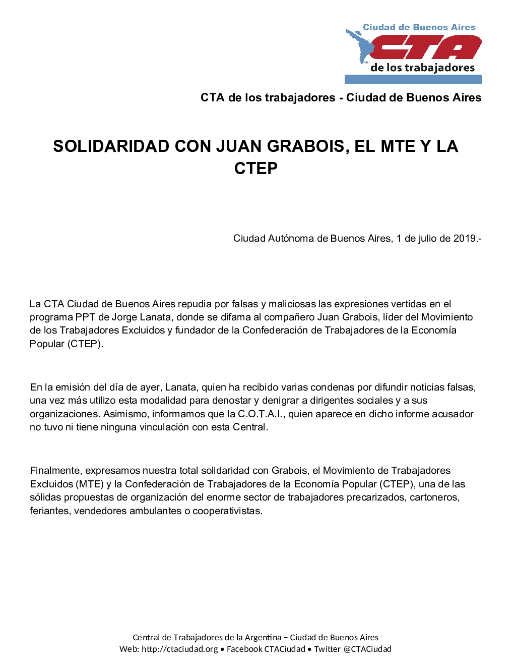 La CTA Ciudad de Buenos Aires repudia por falsas y maliciosas las expresiones vertidas en el programa PPT de Jorge Lanata, donde se difama al compañero Juan Grabois, líder del Movimiento de los Trabajadores Excluidos y fundador de la Confederación de Trabajadores de la Economía Popular (CTEP).
